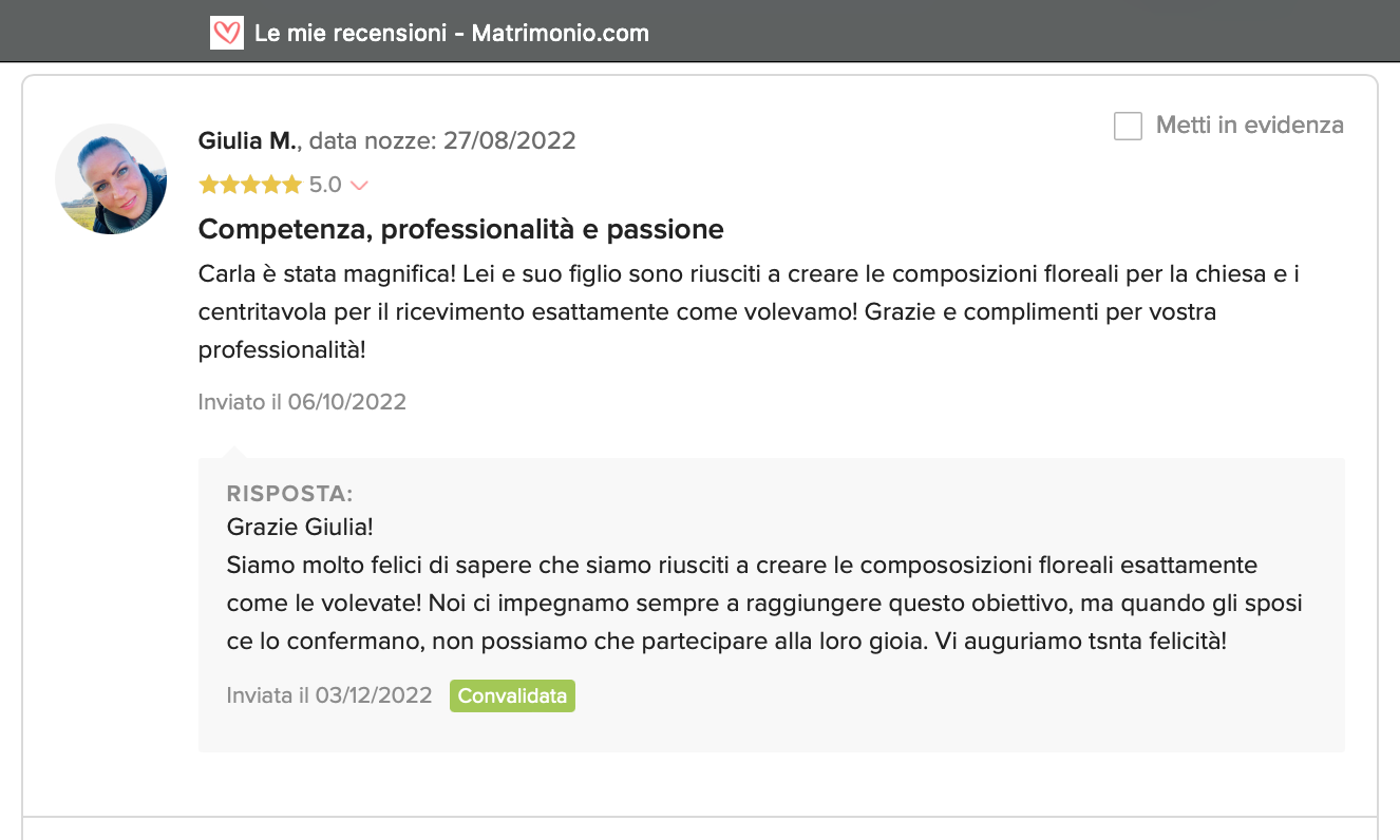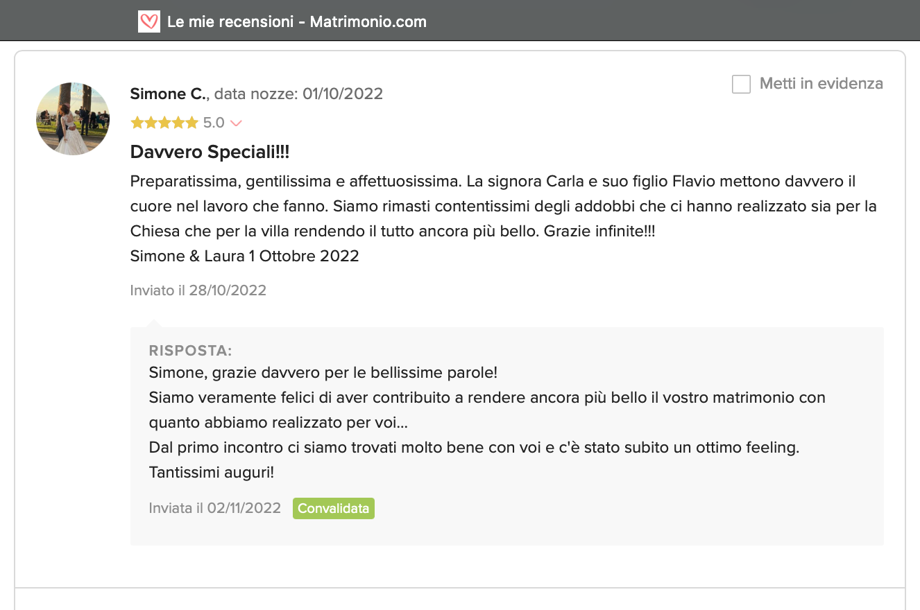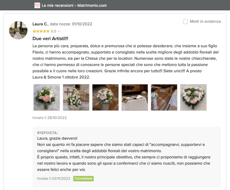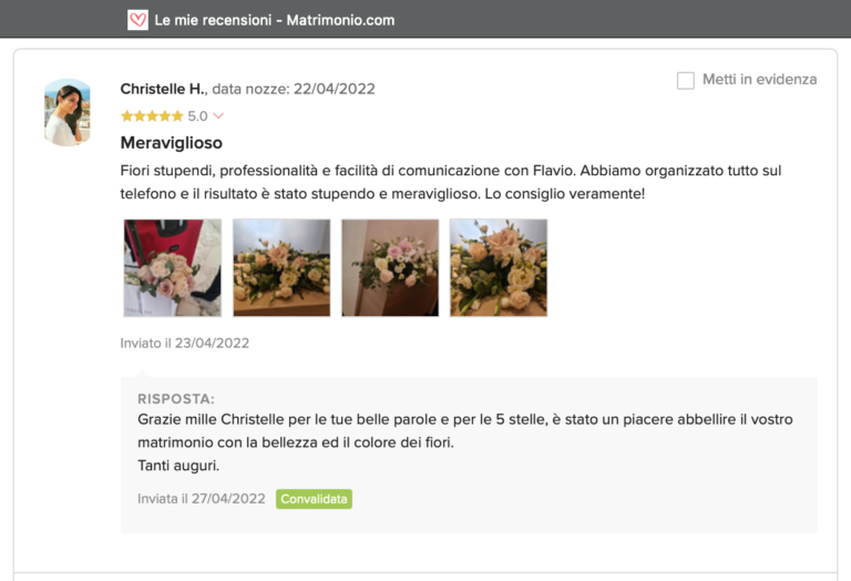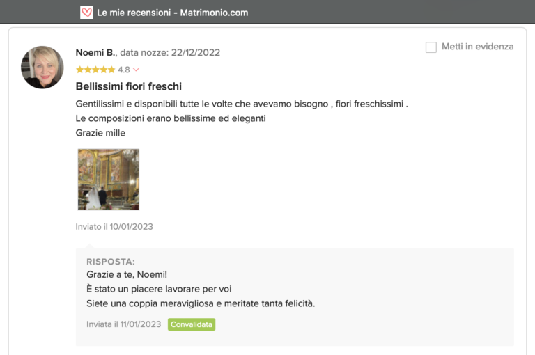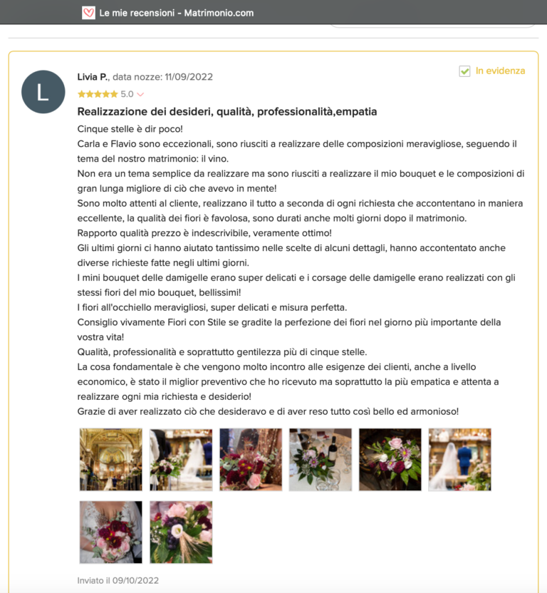 Le nostre recensioni Le recensioni di Fiori con Stile nella pagina di matrimonio.com Ecco le opinioni dei nostri clienti.